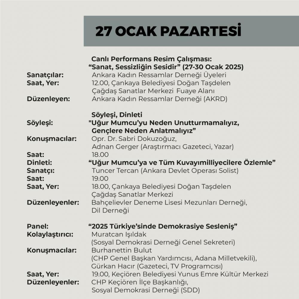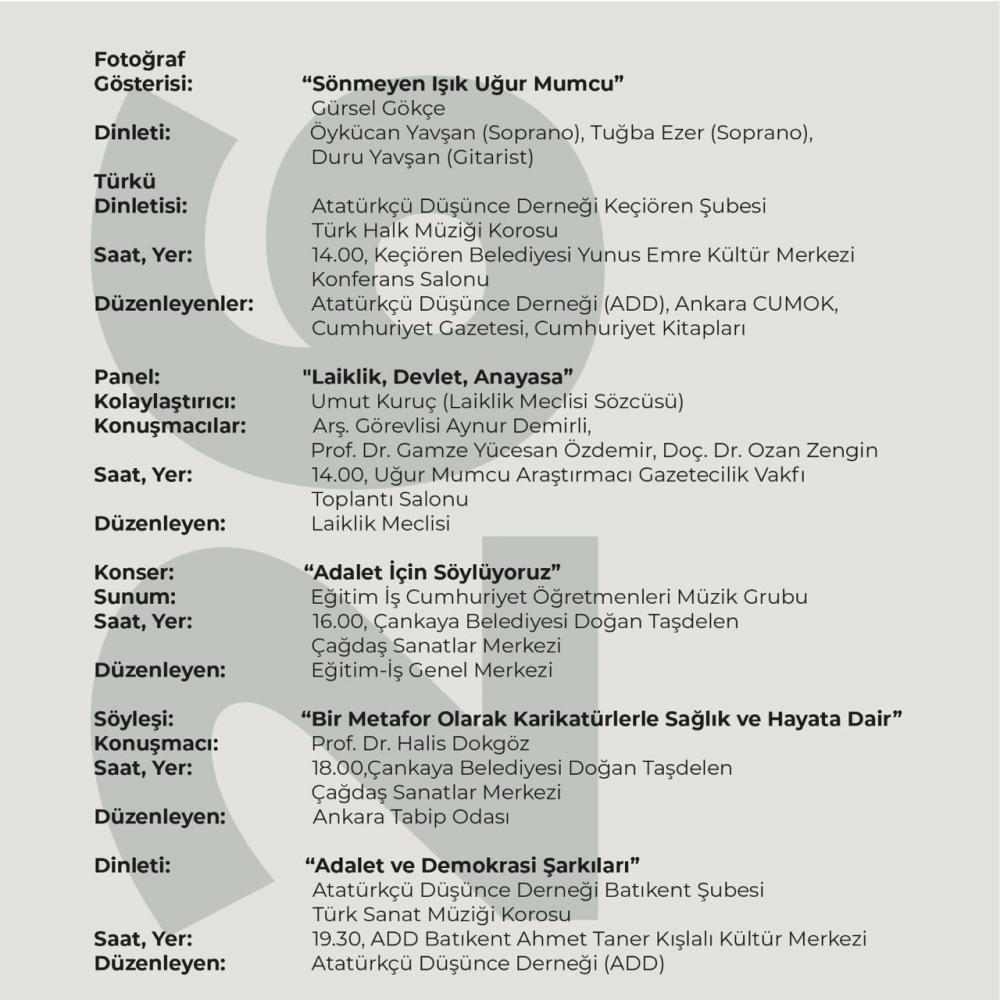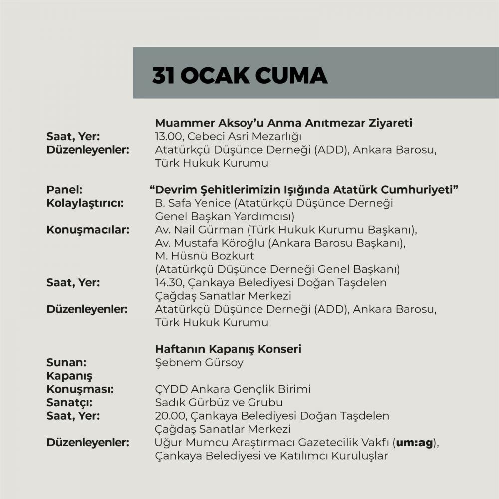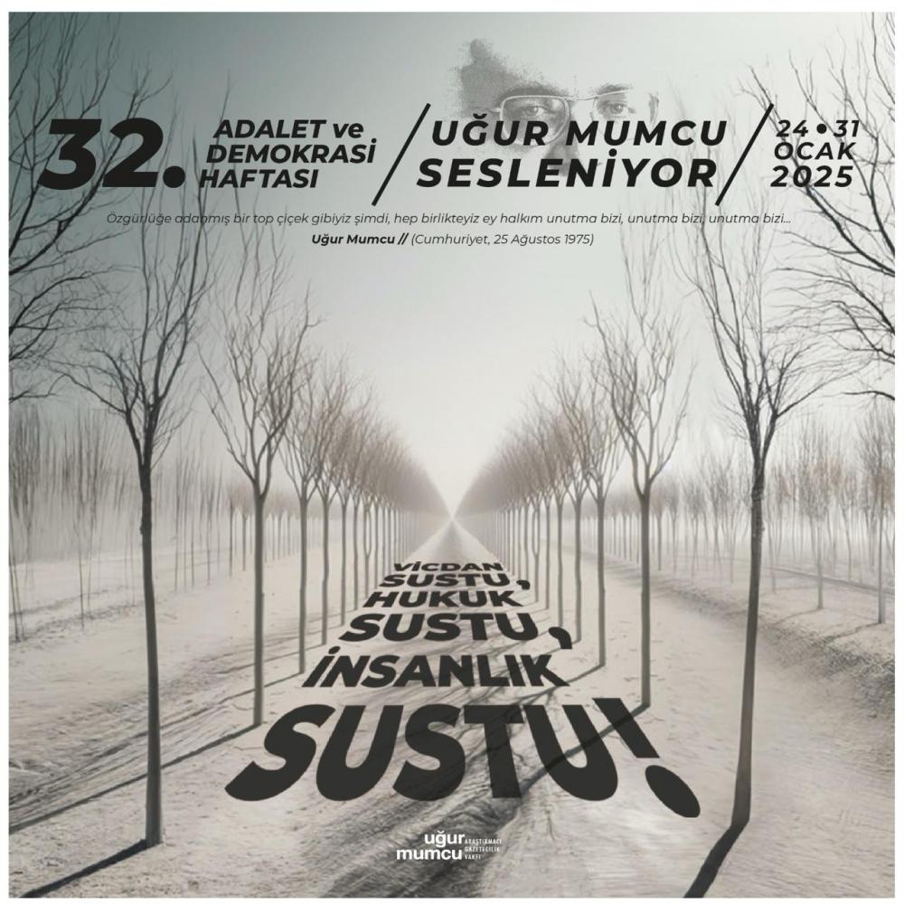 Uğur Mumcu Araştırmacı Gazetecilik Vakfı öncülüğünde, gazeteci yazar Uğur Mumcu ve aydınlarımız anısına düzenlenen 32. Adalet ve Demokrasi Haftası, 24-31 Ocak 2025 tarihleri arasında gerçekleştirilecek.